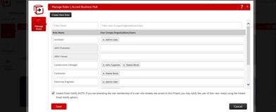 Manage User Roles:Project Administrators can now manage their project roles from the Projects tab in Adoddle version. Administrators can create new roles; assign Users / Organisations / User groups to roles within the Project.