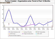 Forms Created - Organization-wise Trend in Past 12 Months • This report gives line chart view for monthly total no. of forms created per organization for the selected projects.